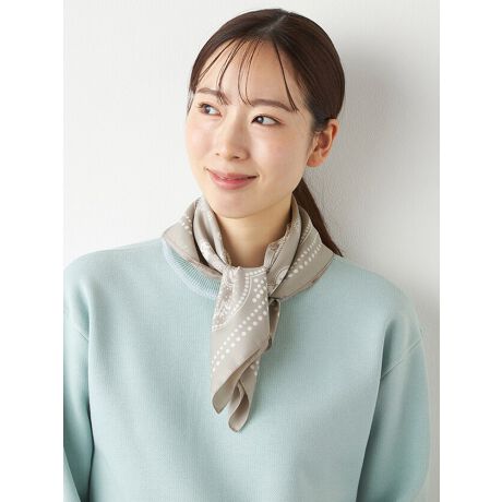 バンダナ柄のスカーフ。素材は軽やかで発色も綺麗なポリエステル100%です。ジーニングスタイルにも綺麗目コーディネートにも合う春色を用意しました。お出かけの時に気軽に持っていただけるコンパクトサイズは贈り物にも喜ばれるアイテムです。