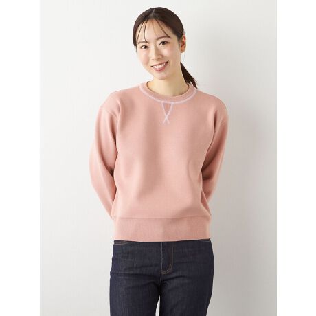 [型番:6251600][型番:6251600]ポリエステルの糸をジャガード編みにしたニット。ニットのような上品さとカットソーのような着心地の良さを兼ね備えています。しわになりにく型崩れしにくいのが特徴です。配色のステッチを入れてスエット風に仕上げました。袖口にはブランドロゴの刺繍を入れて特別感のある1枚に。フレッシュカラーが春のお洒落を演出してくれます。