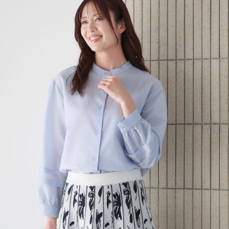 シンプルな中にさりげないデザイン性を加えた、少しリラックス感のあるバンドカラーのシャツブラウス。
