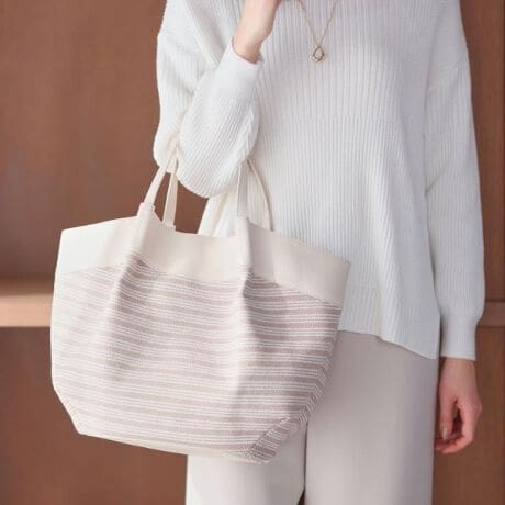 口元とハンドルに施したレザートリムがきちんと感をプラスし、カジュアルすぎない印象に仕上げました。