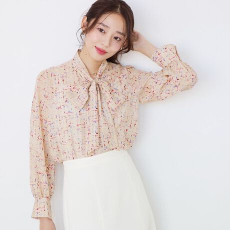 カラフルなプリントが印象的なローン素材のブラウス。