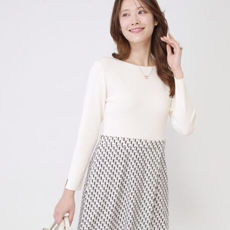 上身頃はニット、スカート部分は合繊布帛プリント素材と異素材を組み合わせたドッキングワンピ―ス。