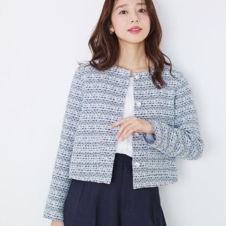 上品で華やかなカラーミックスツイード調のノーカラージャケット。