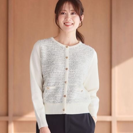 前身頃にツイード風の編み地を施した表情豊かなニットカーディガン。