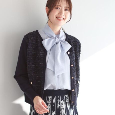 前身頃はACR/W抗ピル素材×テープヤーン×かすり糸を使用して、ニットツイード調で立体感や華やかな雰囲気を出しています。