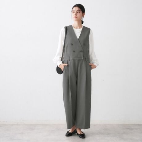 ダブルのジレとパンツをセットアップで着ているように見える、1枚でサマになるオールインワン。