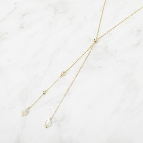 留め具のないラリエットデザインで、結び方・長さで自在にアレンジができ、後ろにまわしてバックポイントにする、チェーンを二重にして短めに使うなど、季節やスタイル、お洋服に合わせてアレンジが可能です◎。