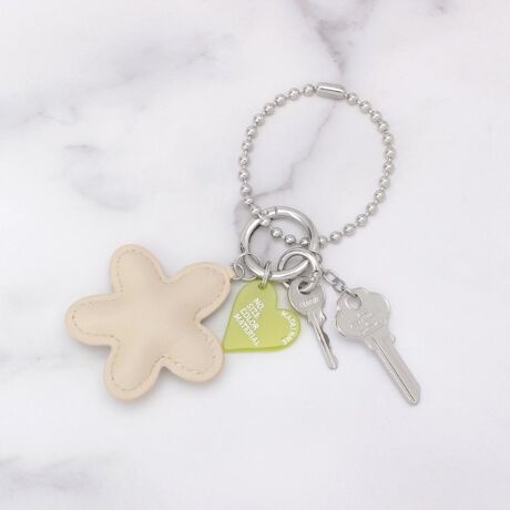 レザー調のフラワーや鍵モチーフ、ボールチェーンなど、さまざまなチャームを組み合わせたトレンド感のあるデザイン。