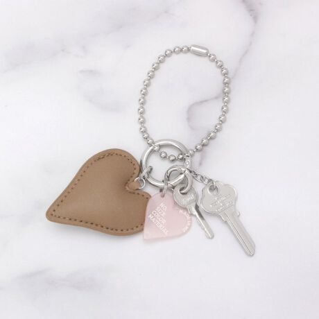 レザー調のハートや鍵モチーフ、ボールチェーンなどさまざまなチャームを組み合わせたトレンド感のあるデザイン。