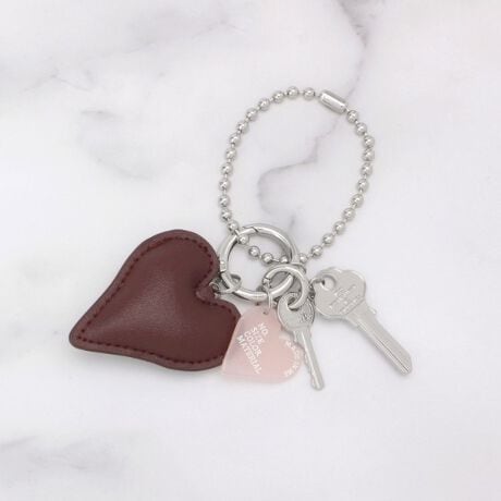 レザー調のハートや鍵モチーフ、ボールチェーンなどさまざまなチャームを組み合わせたトレンド感のあるデザイン。