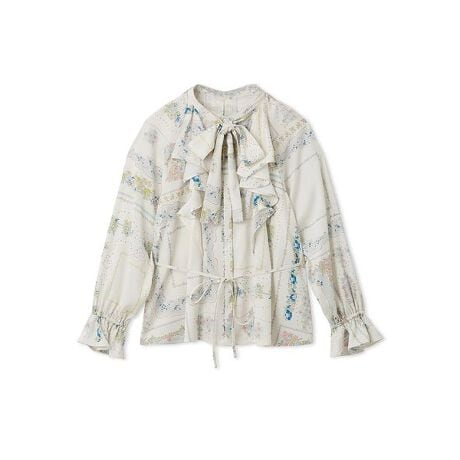 オリジナルのスカーフ柄をプリントした、エレガントなボウタイブラウス。手描き風の柔らかなタッチで仕上げた繊細な柄が、クラシカルかつ上品な印象を引き立てます。ウエストの紐は取り外し可能で、その日の気分に合わせてシルエットの変化を楽しめる仕様。同素材で展開しているスカート(品番LWFB261053)やスカーフ(品番LWGG261356)と合わせれば、統一感のある華やかなスタイリングが完成します。
