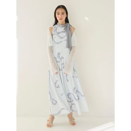 抽象的な筆タッチの大柄リボンプリントと、しなやかに揺れるシルエットがエレガントなボウタイワンピースに、合わせのカーディガンがセットになって登場!