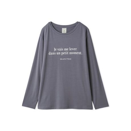 柔らかな風合いと、さらっとした肌触りが快適なインレイ素材のシンプルなロゴプリントシリーズです。胸元にフランス語で「もう少ししたら起きる」という意味のメッセージプリントを入れたロングTシャツ。裾をなだらかにラウンドさせ、ややフレア感を出して着心地良く仕上げました。まだ温かい布団でぬくぬくしていたい朝をイメージした、gelato piqueならではの遊び心あるデザインです。色はアイボリーとピンク、ネイビーの3色展開。同シリーズのロングパンツを合わせてお楽しみいただけます。