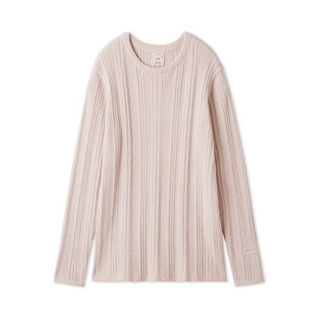 これからの季節の変わり目にうれしい、なめらかな肌触りの‘調温スムーズィー’シリーズです。ヒップにかかるくらいの長めの丈感で着やすく仕上げたプルオーバー。変則リブで単体で着用してもおしゃれ見えする1枚です。調温効果のある成分を練り込んだ糸を使用しているので、気温の変化が大きい時期にも快適な着心地。袖口にワンポイントのロゴ刺繍も添えました。色はアイボリー、ピンク、ネイビーの3色展開。同シリーズのロングパンツとのセットアップもおすすめです。