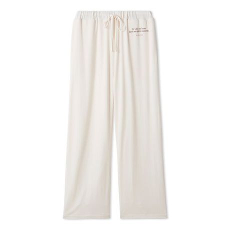 柔らかな風合いと、さらっとした肌触りが快適なインレイ素材のシンプルなロゴプリントシリーズです。左腰にフランス語で「もう少ししたら起きる」という意味のメッセージプリントを入れたロングパンツ。幅広いトップスと合わせていただけるきれいなストレートシルエットで、両脇と右後ろにポケットも付けました。まだ温かい布団でぬくぬくしていたい朝をイメージした、gelato piqueならではの遊び心あるデザインです。色はアイボリーとピンク、ネイビーの3色展開。同シリーズのロングTシャツを合わせてお楽しみいただけます。