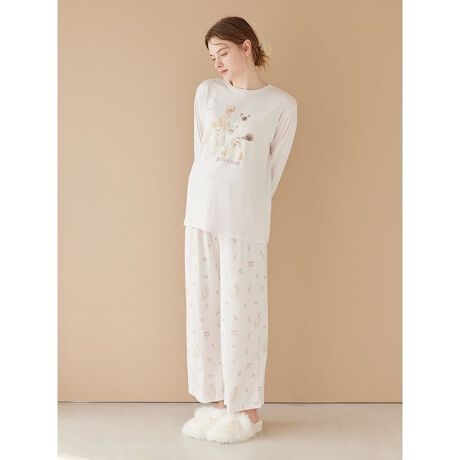 春の訪れを感じさせる、明るいピケカラーをまとったキャット柄プリントのカットソーシリーズです。季節感のある小花柄と猫の絵柄を組み合わせた、総柄プリントのロングパンツ。ゆったりとはけるストレートシルエットに、キュートな表情の猫をたっぷりとプリントしました。小花柄の色はイエロー、ピンク、ブルーの3色。それぞれの柄に異なる毛色の猫をプリントしています。同シリーズのロングTシャツを合わせたり、同時期に展開するフェザーニットのカーディガンとのコーディネートもおすすめです。