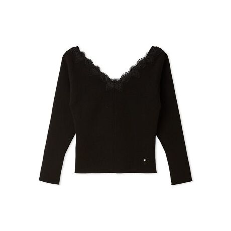 衿ぐりに繊細なハートモチーフを感じるレースをあしらったニットプルオーバー。