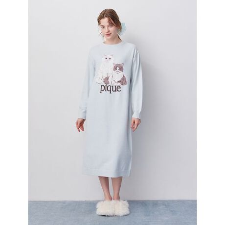 春の訪れを感じさせる、明るいピケカラーをまとったキャットジャガードのシリーズです。ロングヘアの猫たちをジャガードで大きく描いた、軽やかな‘エアリーモコ’素材のワンピース。くるぶし上の長めの丈感なので、まだまだ寒さが残る春先まで1枚でゆったりとお楽しみいただけます。色はイエローとピンク、ブルーの3色展開で、特にイエローのボディには、従来のキャットシリーズには登場しなかったミルキーなキャメルカラーのハチワレ猫をデザインしたのがポイントです。同シリーズのソックスやブランケットと合わせたり、猫の日に向けてのギフトなどにもおすすめ。同時期に展開するキャット柄の寝具シリーズとコーディネートすれば、モフモフの“猫まみれ”なおうち時間をお楽しみいただけます。