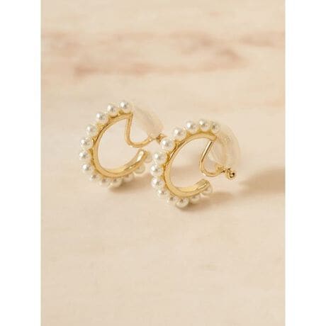 A:細めのハーフフープ型イヤリングに小粒パールビーズを並べたデザインがエレガントで華やかなゴールドイヤリング。