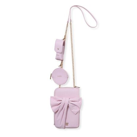 ふんわりパフィーな素材でお作りしたスマホ&お財布ポーチや、イヤホンなどが入るフェイクレザーの丸型ポーチとリップなどが入るケースがセットになったミニショルダーです。