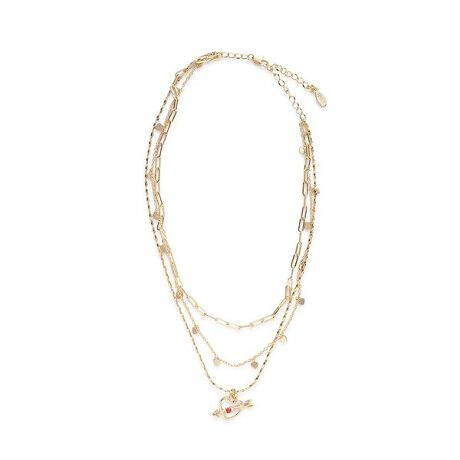 異なるデザインと長さのチェーンを組み合わせた三連ネックレスは華奢さと存在感を兼ね備えたアイテム。小さなハートが連なるチェーンや矢の刺さったハート形のチャームにクリスタルを添えたデザインで可愛らしさと華やかさを演出。反射が美しいスエッジチェーンや平たいデザインチェーンが首元に動きを加えます。長さ調節が可能なアジャスターチェーンは、先端に付いたロゴプレートがさりげないアクセントに。ロゴ入りの小サイズのボックス付き。