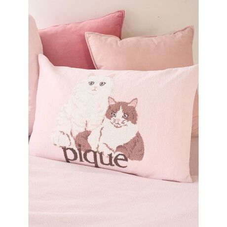 春の訪れを感じさせる、明るいピケカラーをまとったキャットジャガードのシリーズです。仲良く寄り添う猫たちをジャガードを描いた、軽やかな‘エアリーモコ’素材のピローケースです。春先にかけてちょうど良い、さらっとした肌触り。白猫とハチワレ猫の組み合わせで、色はイエローとピンクをご用意しました。特にイエローの方には、従来のキャットシリーズには登場しなかったミルキーなキャメルカラーのハチワレ猫をデザインしたのがポイントです。同シリーズのマルチカバーやクッションと合わせたり、猫の日に向けてのギフトなどにもおすすめです。