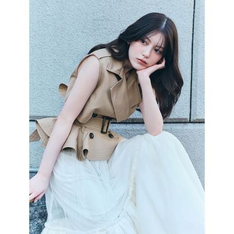 クラシカルなトレンチ型ノースリトップスと、シアー感の美しいボリューミーなチュールスカートを組み合わせたトレンド感満載なレディなセットアイテムが届きました。