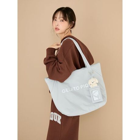 ふっくらとした中綿入りのナイロン素材を使用した、軽やかな印象のパファートートバッグです。A3サイズの書類や16インチPCも余裕で入るサイズ感で、毎日の通学・通勤にもおすすめ。開口部は中身がしっかりカバーできるファスナー仕様で、内側にはぐるりとゴム入りのポケットを付けているので小物を整理できます。色は淡いトーンのピンク、ブルー、ベージュをご用意。同じ素材で他にショルダーバッグも展開しているほか、同時期に展開するトイプードルのカードケースと組み合わせるのもおすすめです。