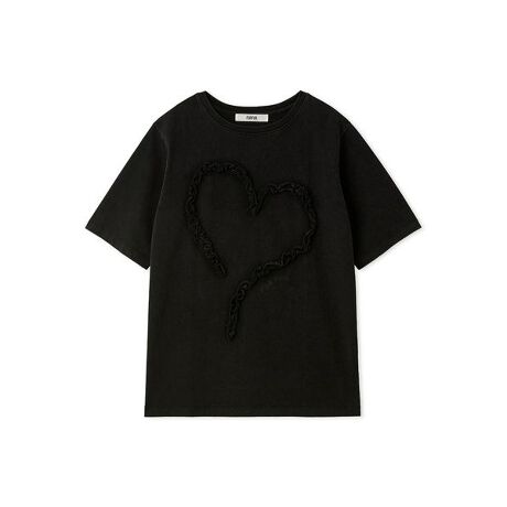 大きなフリルのハート型が印象的なビッグシルエットのTシャツです。染め加工による独特な色合いと風合いが特徴的で、同色にプリントされたロゴもポイントのアイテムとなっております。