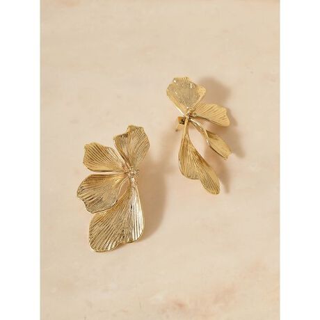立体感のある複数のメタル素材の花びらに中央部に小さなビジューを散りばめた華やかなフラワーモチーフピアスが完成。