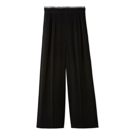 シルエットはワイドよりもすっきりとしたストレートワイドで仕上げ、マニッシュな雰囲気の中にレースの柔らかさをバランスよく調和させています。