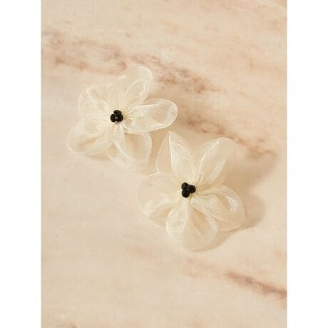 B:透け感と艶感のあるホワイトオーガンジー素材を使用し、ふんわりと空気をはらむ立体的なフラワーモチーフにアレンジしたピアスです。