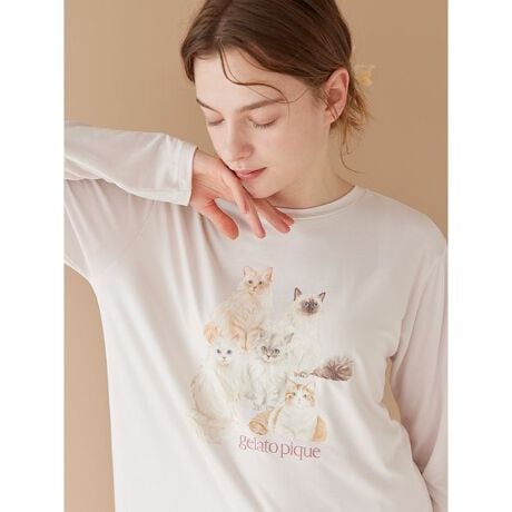 春の訪れを感じさせる、明るいピケカラーをまとったキャット柄プリントのカットソーシリーズです。毛色の違う5匹の猫たちをプリントした、猫の日にもぴったりのしなやかなロングTシャツ。それぞれのポーズやもふもふの毛並み、表情の愛らしさまでこだわったスペシャルな1枚になっています。色はオフホワイトとピンクの2色展開。同シリーズのロングパンツを合わせてお楽しみください。