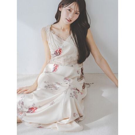 <b>【繊細なレーステープとヴィンテージライクな華やかなフローラルプリントが優雅に交わるロマンティックなサテンキャミワンピース】</b>
