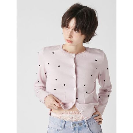 上品な光沢としなやかな風合いが魅力のカシミア混糸を使用した、コンパクトシルエットのニットカーディガン。カラーごとに異なるモチーフ刺繍をあしらい、“LILY BROWNより愛を込めて”というメッセージを込めた特別感のある一枚です。襟ぐりと袖口は、さりげなくラメを引きそろえたスカラップ編みで上品な甘さをプラス。ボタンにはハート型の貝ボタンを採用し、シンプルながらも1枚で主役になる華やかさを演出します。ワンピースにもデニムにも合わせやすい、万能なカーディガンです。