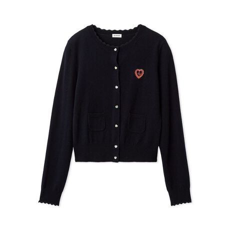上品な光沢としなやかな風合いが魅力のカシミア混糸を使用した、コンパクトシルエットのニットカーディガン。カラーごとに異なるモチーフ刺繍をあしらい、“LILY BROWNより愛を込めて”というメッセージを込めた特別感のある一枚です。襟ぐりと袖口は、さりげなくラメを引きそろえたスカラップ編みで上品な甘さをプラス。ボタンにはハート型の貝ボタンを採用し、シンプルながらも1枚で主役になる華やかさを演出します。ワンピースにもデニムにも合わせやすい、万能なカーディガンです。