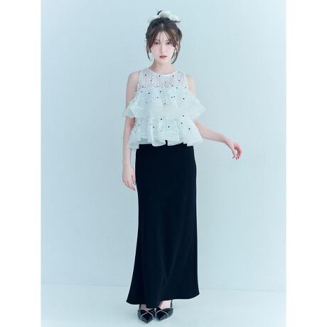 バイアス地なので、落ち感があり、すっきりとしたフォルムでレディな雰囲気に。