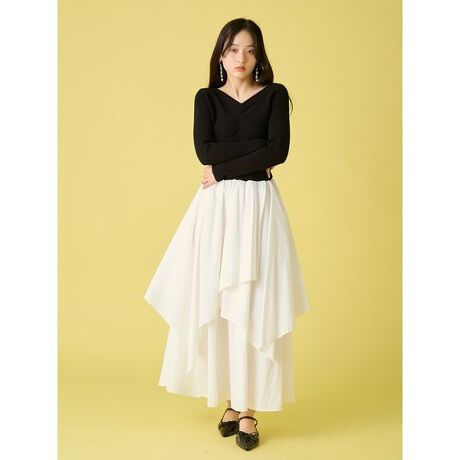 トップ部分は柔らかなリブニット、スカート部分は軽やかなタフタ素材を使用。分量感たっぷりのスカートはイレギュラーヘムラインで動きのある表情を生み、モードな雰囲気を引き立てます。