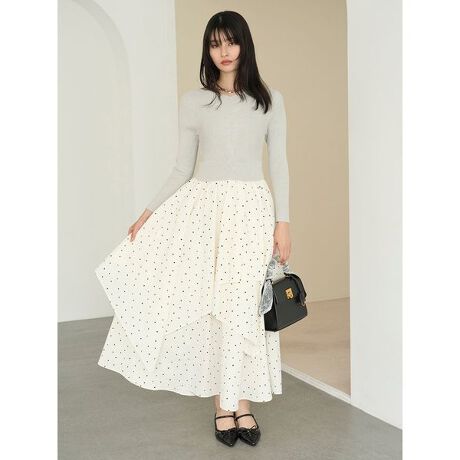 トップ部分は柔らかなリブニット、スカート部分は軽やかなタフタ素材を使用。分量感たっぷりのスカートはイレギュラーヘムラインで動きのある表情を生み、モードな雰囲気を引き立てます。