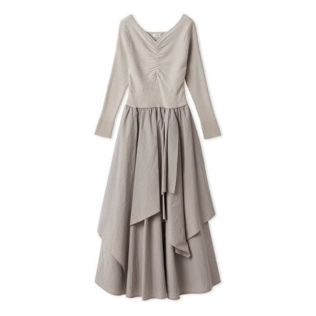 トップ部分は柔らかなリブニット、スカート部分は軽やかなタフタ素材を使用。分量感たっぷりのスカートはイレギュラーヘムラインで動きのある表情を生み、モードな雰囲気を引き立てます。