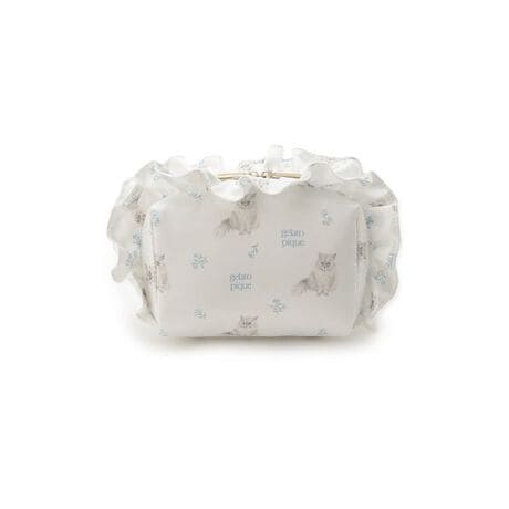 春の訪れを感じさせる、明るいピケカラーをまとったキャット柄プリントの雑貨シリーズです。季節感のある小花柄と猫の絵柄を組み合わせた、総柄プリントのポーチ。品のある艶やかな素材感で、ダブルファスナーの周りにフリルをあしらい、デスク等に置いても可愛さを放ちます。マチありで内ポケットも付いており、コスメなどをすっきり収納可能。小花柄の色はイエロー、ピンク、ブルーの3色で、それぞれの柄に異なる毛色の猫をプリントしました。同シリーズのルームウェアや雑貨を合わせたり、猫の日に向けたギフトにもおすすめのアイテムです。