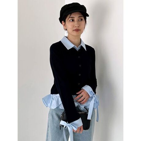 襟付きニットカーディガンに、シャツ襟デザインをドッキング。