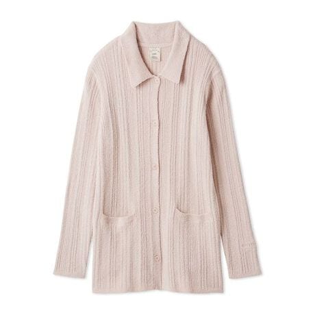 これからの季節の変わり目にうれしい、なめらかな肌触りの‘調温スムーズィー’シリーズです。ヒップをゆったりとカバーする長めの丈感で仕上げた襟付きカーディガン。変則リブとトレンドライクな襟付きのデザインで、羽織りにはもちろん、単体で着用してもおしゃれ見えする1枚です。調温効果のある成分を練り込んだ糸を使用しているので、気温の変化が大きい時期にも快適な着心地。フロントの左右にポケットを付け、袖口にワンポイントのロゴ刺繍も添えました。色はアイボリー、ピンク、ネイビーの3色展開。同シリーズのロングパンツとのセットアップもおすすめです。