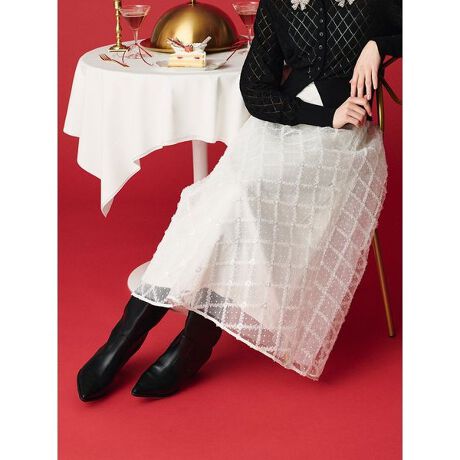 ドット柄のチュール生地に格子状に叩き付けた共地のチュールと、横向きのハート型にデザインされたスパンコールがポイントのスカートです。程よく輝くスパンコールが大人なムードを演出し、フェミニンなコーディネートがおすすめのアイテムになっております。