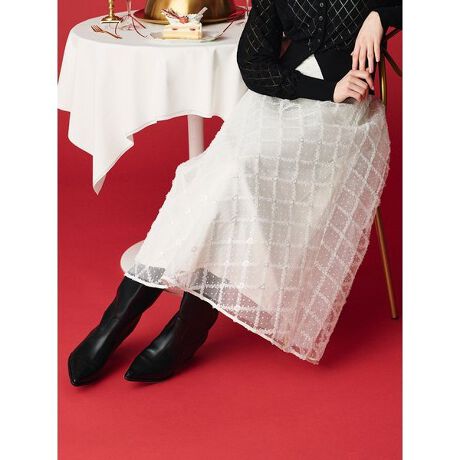 ドット柄のチュール生地に格子状に叩き付けた共地のチュールと、横向きのハート型にデザインされたスパンコールがポイントのスカートです。程よく輝くスパンコールが大人なムードを演出し、フェミニンなコーディネートがおすすめのアイテムになっております。