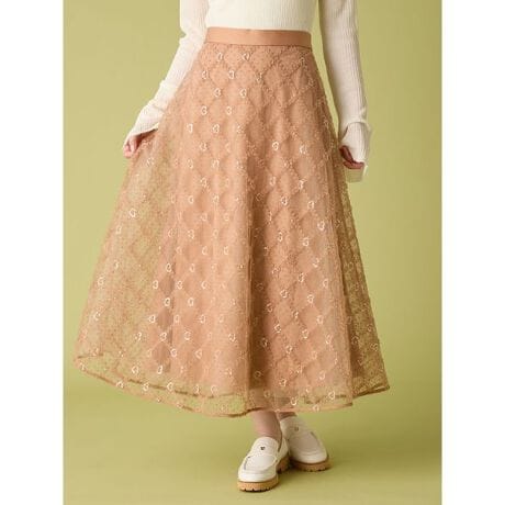 ドット柄のチュール生地に格子状に叩き付けた共地のチュールと、横向きのハート型にデザインされたスパンコールがポイントのスカートです。程よく輝くスパンコールが大人なムードを演出し、フェミニンなコーディネートがおすすめのアイテムになっております。
