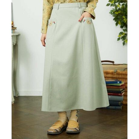ワンポイント刺繍が目を惹くフレアスカート。フロントに切り替えを施したすっきり見えのフレアシルエットが魅力。切り替えを活かしたポケット口には大きなお花刺繍をプラスしました。バックウエストはゴム仕様でリラクシーな着用感を、サイド開きのファスナーで綺麗なシルエットの両方を兼ね備えたスカートは、ベーシックながらもこだわりの詰まったひと品です。