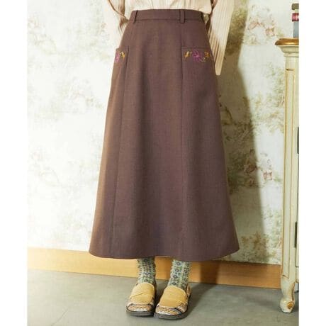ワンポイント刺繍が目を惹くフレアスカート。フロントに切り替えを施したすっきり見えのフレアシルエットが魅力。切り替えを活かしたポケット口には大きなお花刺繍をプラスしました。バックウエストはゴム仕様でリラクシーな着用感を、サイド開きのファスナーで綺麗なシルエットの両方を兼ね備えたスカートは、ベーシックながらもこだわりの詰まったひと品です。