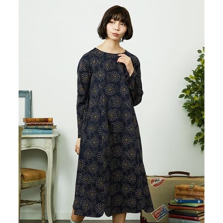カラフルな花柄がホコモモラらしいワンピース。季節の変わり目にはインナーや羽織りで調整しながら着用可能で、春本場は一枚着でお楽しみいただけます。