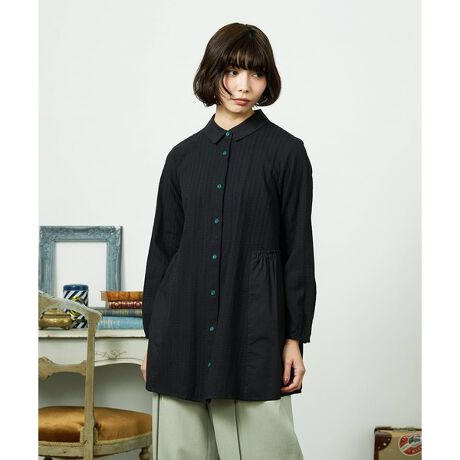2種類の生地をドッキングしたロング丈ブラウス。サイドに切り替えを施し、裾に向かって広がるAラインのシルエットで腰回りのカバーを叶えます。セットインスリーブで全体のボリューム感を抑え、すっきりした印象をプラス。首元は襟付きで大人かわいいデザインに。配色ボタンがアクセントとなり華やかさを演出。無地見えながらも適度にデザイン性があり、着回しのしやすい一着です。